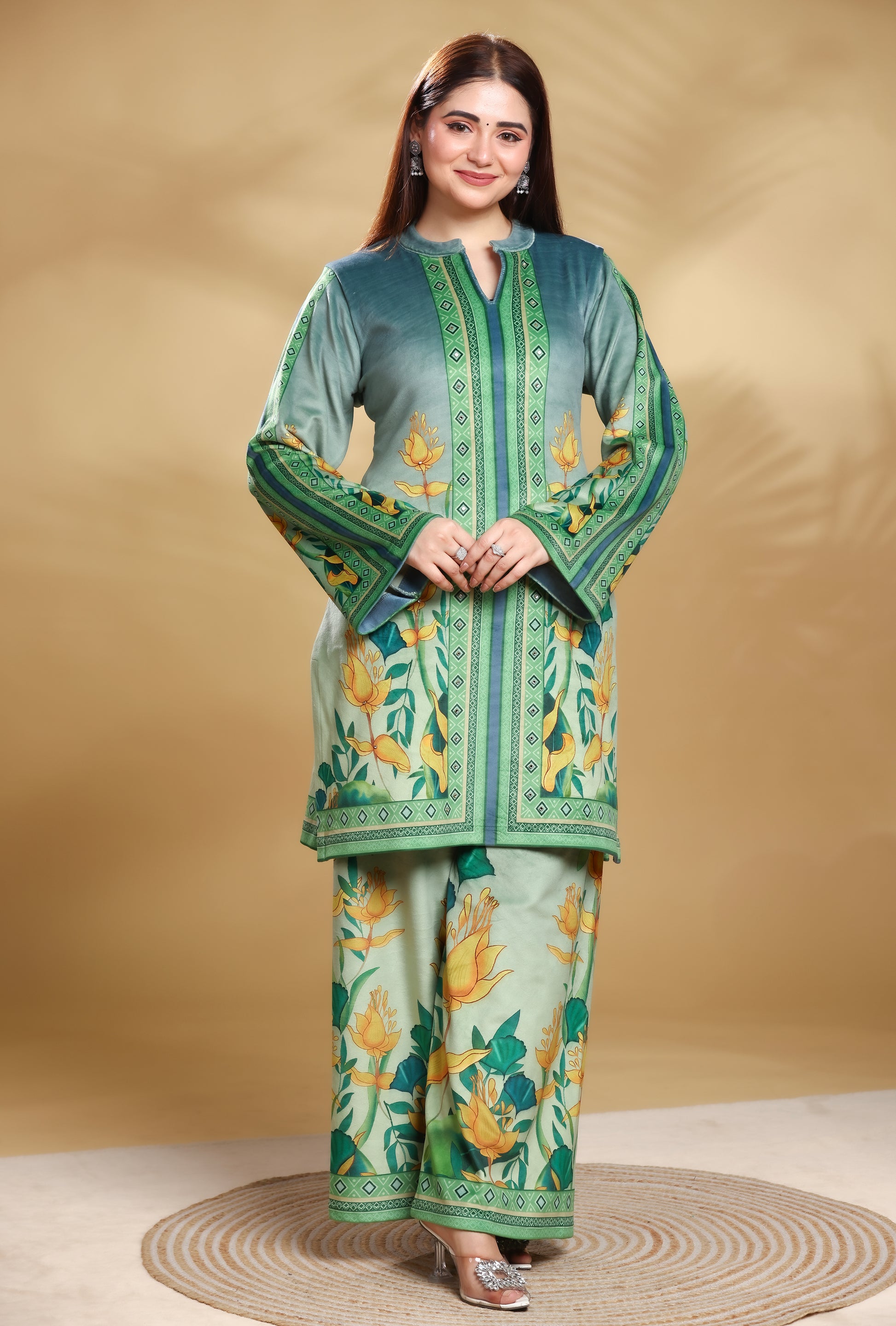 Step into effortless winter style with the Velvet Mirage Printed Co-ord Set, crafted for women who love a clean, modern look. The soft velvet fabric carries a refined all-over print, giving the outfit a sophisticated yet easy-going vibe.